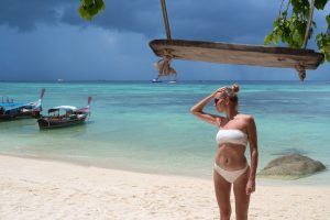 Happy woman standing on the sandy beach over sea and blue sky ba
